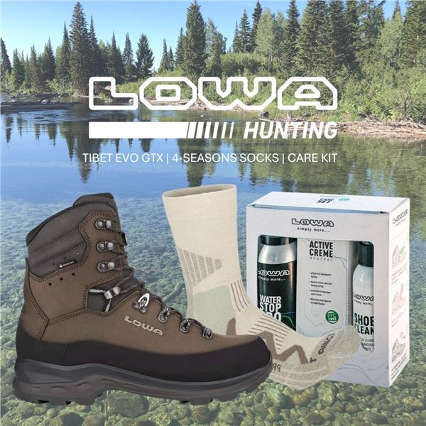 One (1) pair of Men's TIBET EVO GTX hunting boots, one (1) pair of 4-season LOWA socks in black, coyote op, desert, or ranger colors, and One (1...