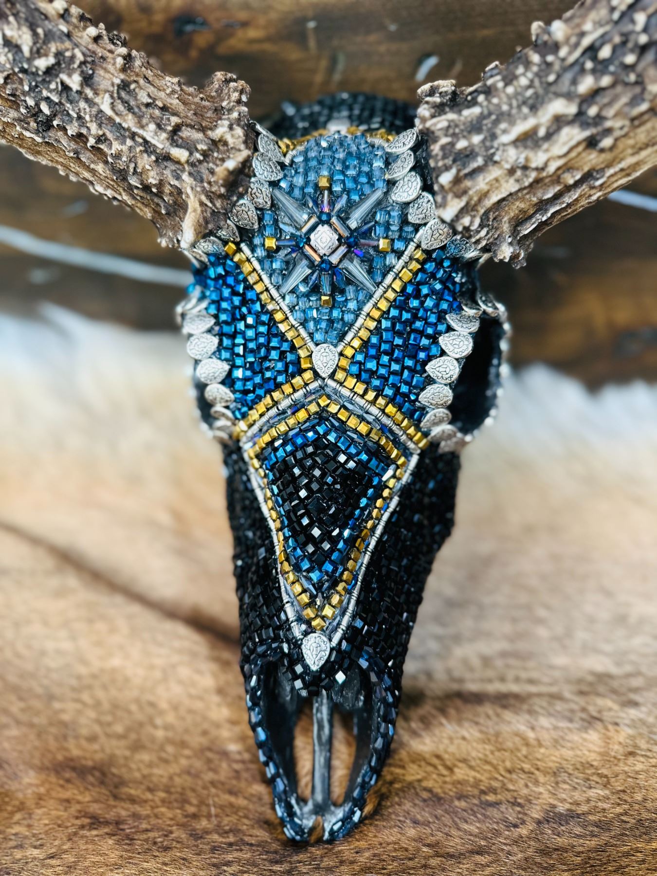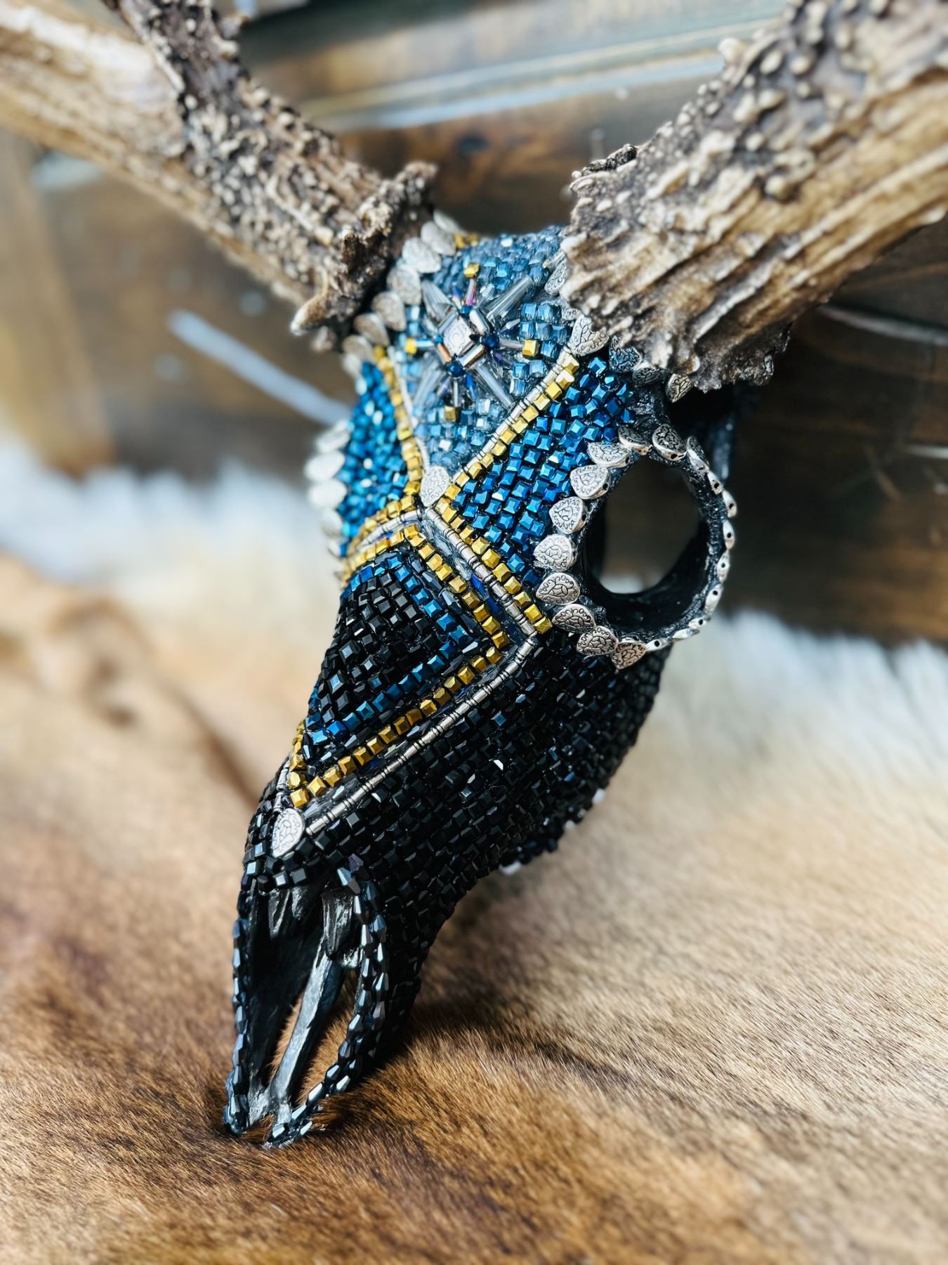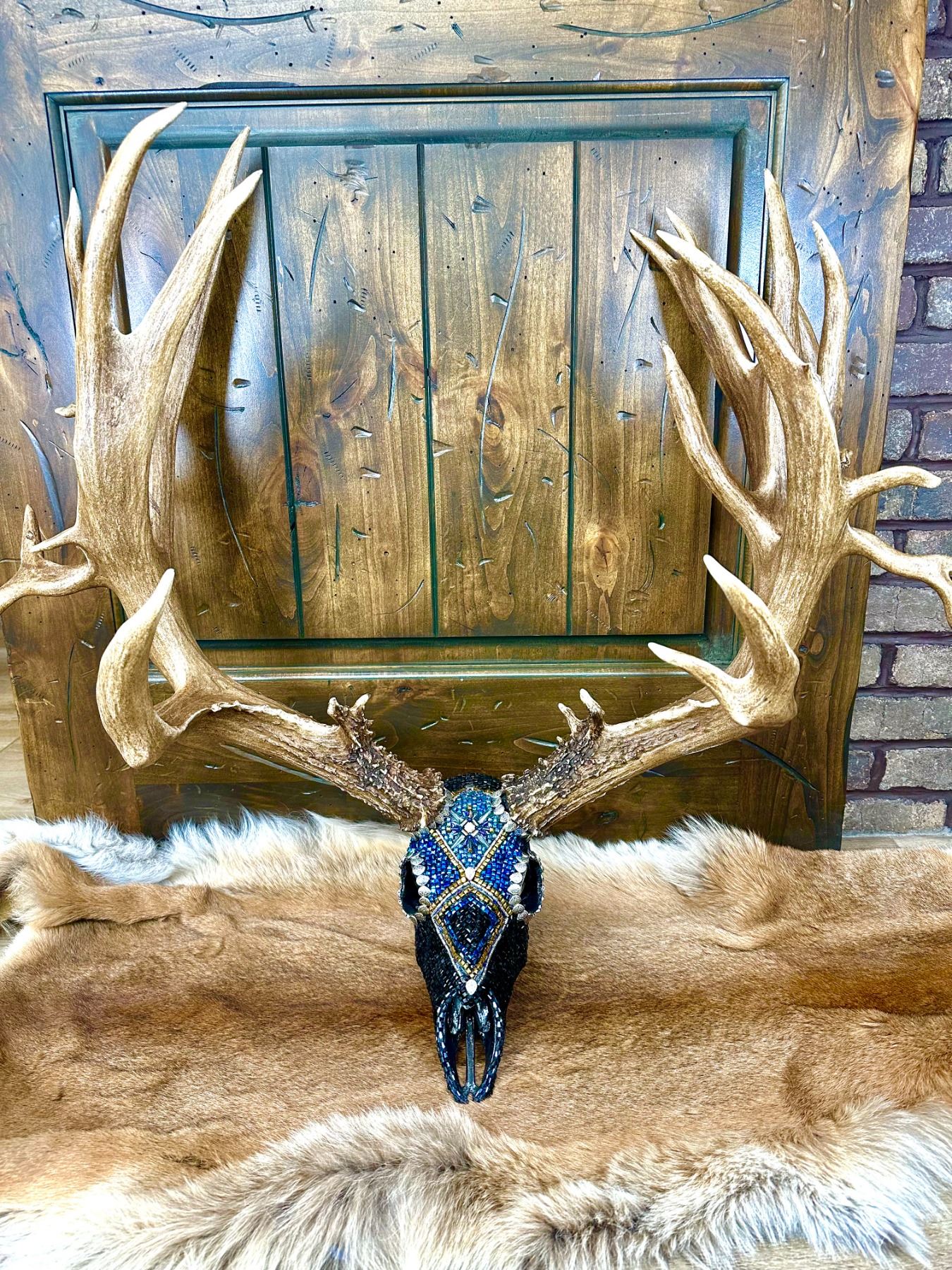 Skull artist Jana Waller Bair added Swarovski Crystals to create this unique and amazing piece. Skull & replica antlers donated by Kolyer Andersen of Split Image Replicas. Kolyer & Jana have been supporting conservation for years and always come together to create an amazing piece that anyone would be happy to display in their home, office or cabin. Beautiful hand-made metal base built by Barclay Mechanical.
